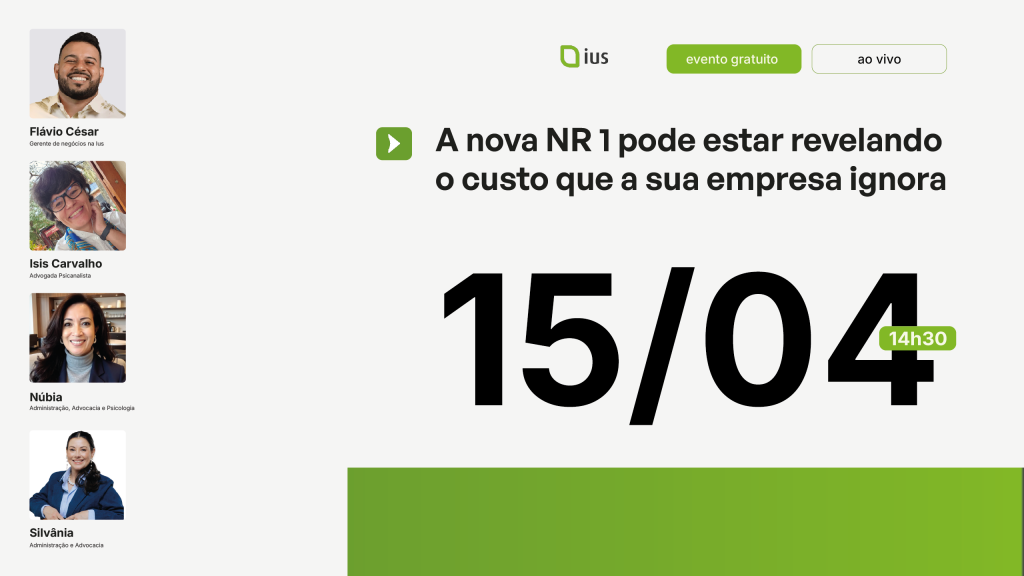 A Ius apoia sua empresa muito além da interpretação da NR-1, oferecendo uma abordagem prática e estratégica para transformar a exigência legal em um processo estruturado de gestão. Por meio de capacitação com especialistas, metodologia aplicada e suporte técnico contínuo, a empresa orienta desde a identificação dos riscos psicossociais até a implementação de medidas efetivas de prevenção e controle, garantindo conformidade jurídica, redução de passivos e melhoria do ambiente organizacional. Com o apoio da Ius, sua gestão deixa de ser reativa e passa a atuar de forma preventiva, com segurança, eficiência e embasamento técnico em todas as etapas da adequação à norma. Clique no banner abaxo para participar do nosso bate-papo sobre as atualizações da NR 1.