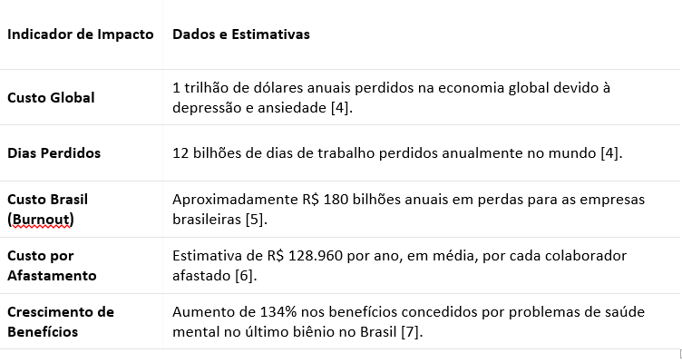 Para compreender a importância estratégica da NR-1, é fundamental analisar o impacto financeiro do adoecimento mental nas empresas. Muitas vezes, esses custos permanecem invisíveis nos balanços tradicionais, mas corroem silenciosamente a lucratividade e a competitividade.