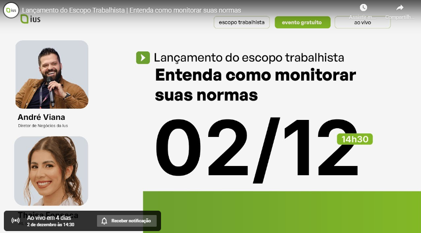 E para apresentar todas essas atualizações — inclusive o novo escopo trabalhista da plataforma — realizaremos uma live especial de lançamento no dia 02/12, às 14h30. Durante a transmissão, nossa especialista em IRL Thaisa Fonseca e o diretor de negócios André Viana irão explicar como estruturar um processo completo de gestão trabalhista e demonstrar como a IUS pode transformar essa rotina na sua empresa.
